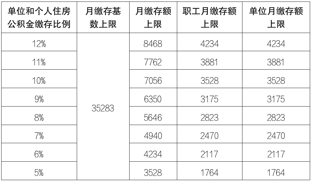 2024住房公积金年度住房公积金月缴存基数上限为35283元,具体缴存比例对应月缴存额上限见附件;月缴存基数下限为2420元,领取基本生活费职工的月缴存基数下限为1694元,新受理的住房公积金个人住房贷款,计算借款申请人贷款金额所使用的月基本生活费标准按1694元执行。